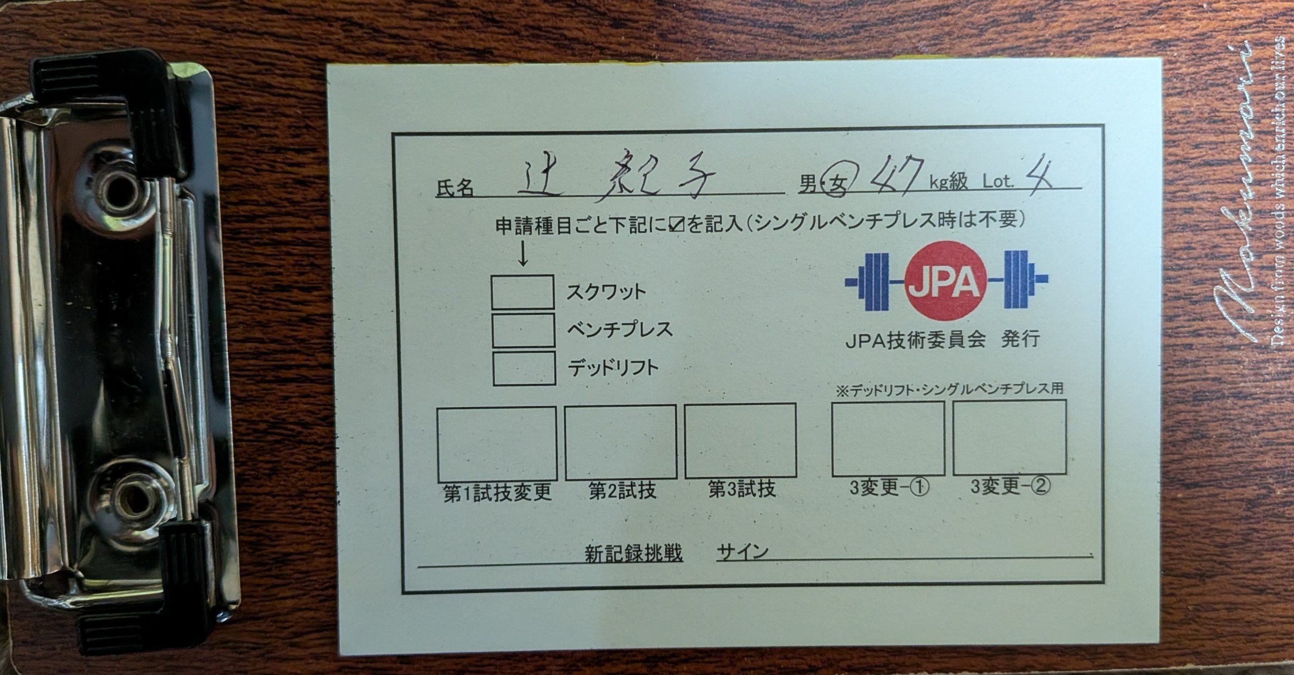 氏名、男女、階級、ロッドナンバー等の記入できる箇所を予め記入しておいてください。変更を想定してベンチプレスの大会で4~5枚ほど、3種目では9~10枚ほど用意しておくといいです。全国大会では次の重量申請は試技表でになります。バインダーは自由ですがボールペンは必須になります。次の重量申請が出来るのは試技終了“判定“コールの後の1分以内です。ここでは次の重量を記入する時間しかないです。書けるところは予め書いておいた方がいいです。全国大会はタイマーできっちり計っています。ここも地方大会のように次の重量を聞いてはくれません。この1分以内に申請がないと失敗した場合は同重量、成功しても2.5kgしか増量する事が出来ないのでお気を付けください。ベンチプレス、3種目とも同様です。