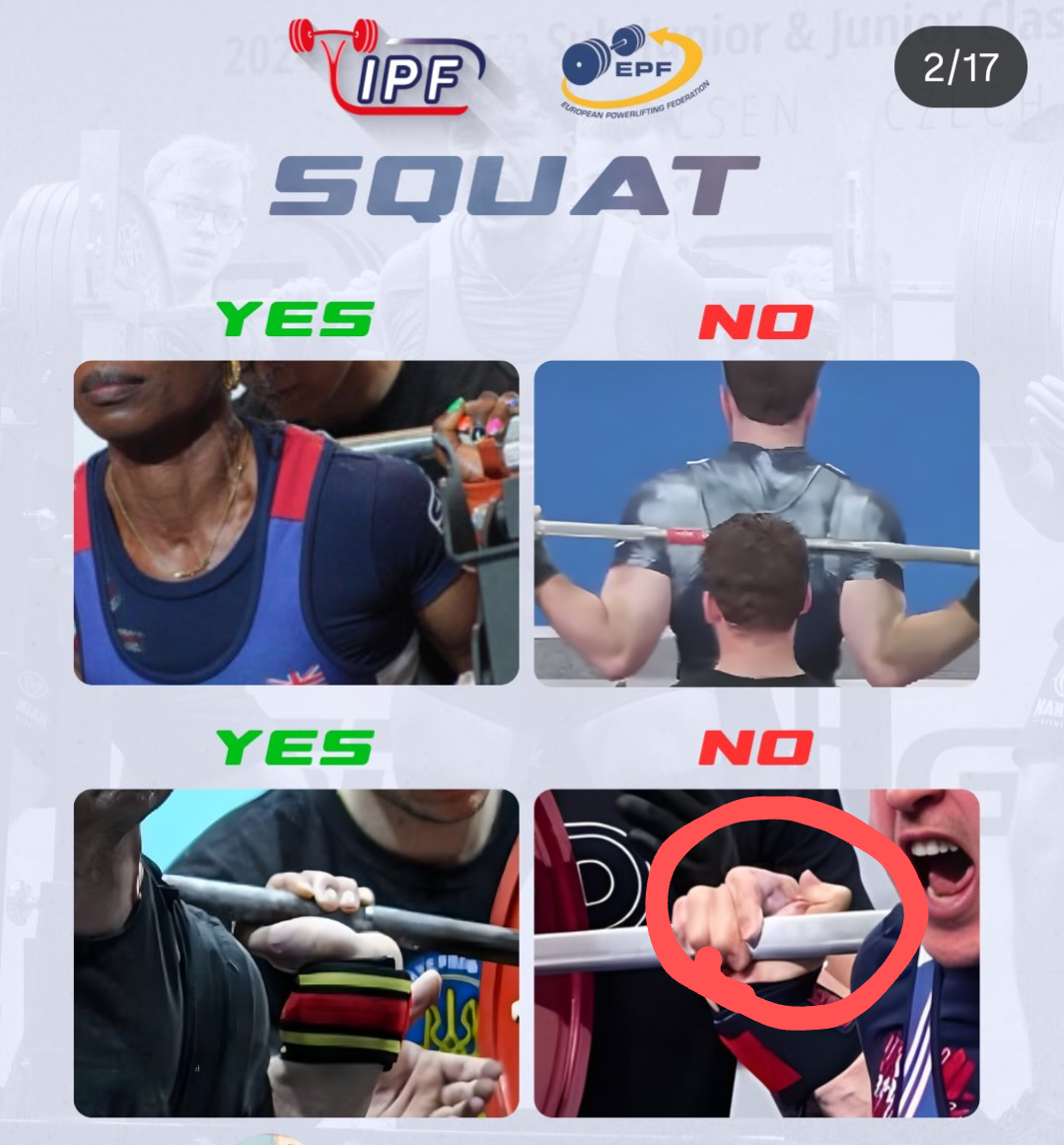 【スクワットにおいて】バーをサムレスグリップで握る、または三角筋後部より低い位置で担ぐは反則行為となります。